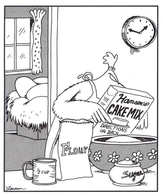 The Crown will drop today and we’ll start watching that during the week, but we did watch the three available Mandalorians this week. Excellent, but I was kind of appalled at the egg-eating. It did, though, remind me of this Far Side cartoon, which I had on my fridge for a long time: