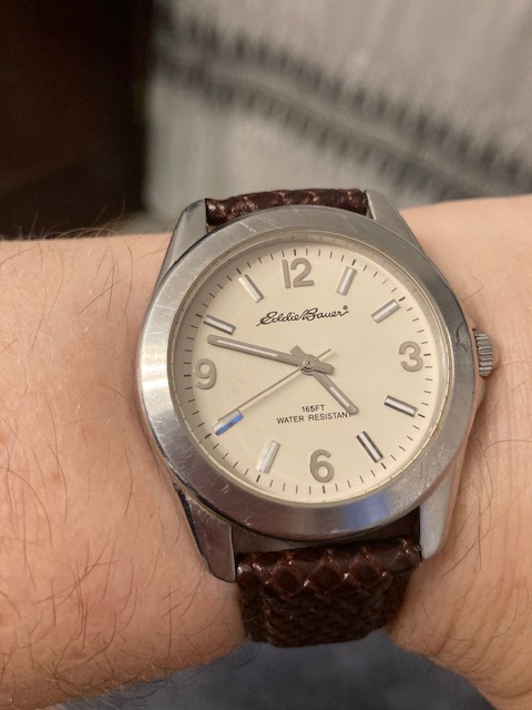 When we were down in Durham when my mom passed away last year, my Dad found a watch he didn’t want and gave it to me. It needed a new band and battery, so I put it in my project box to deal with later. And it disappeared for over a year, until I found it at the bottom of a tote bag while reorganizing the office closet this weekend. So this afternoon I went out and got a mocha and went to my jewelry/watch guy in the neighborhood and now it’s good to go.