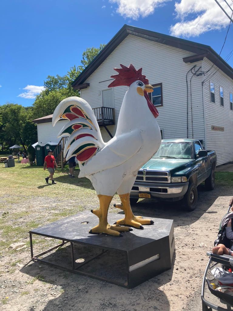 Another mostly leisurely morning. I wasn’t seeing the K’s today. My only solid plan is I needed to end up in East Stroudsburg, PA by mid-afternoon. Van was working at a small outdoor festival in nearby Parksville, for which he’d made the t-shirts. A randomly chicken-themed fair in a field out back of a local restaurant, with craft booths and food and drink and a soundstage with various bands playing all day long – starting out with kid’s music and ending up with cover bands like “Bon Twat” (heh heh. heh heh.)