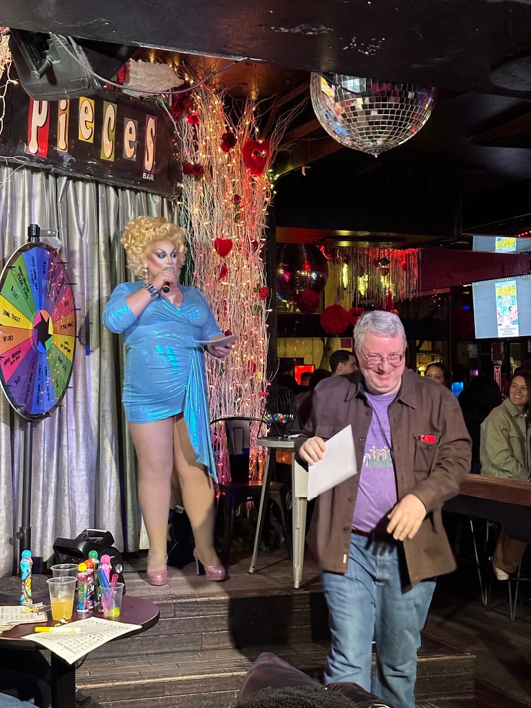 Last Sunday, I did my monthly visit to the cemetery, which is always lovely and peaceful, then to the nearby diner, which is always fun. Putzed around for the rest of the day until it was time to go into town. Back when I’d moved to New York City, but my college roommate Vance was in Detroit, as I bragged about going to Broadway shows or the opera or whatever New Yorky thing I was enjoying, he’d envy my “That Girl” lifestyle. But since he and Craig moved to Connecticut, they are far more “That Girl”y than I – they see shows and concerts much more often, and go to entertaining gay stuff a lot too. Which is how I ended up getting invited to Drag Bingo at Pieces. V&C are old hands at drag bingo, but I’d never been, and since I’d just had dinner with them the Friday before, they gave me the scoop on how it all works, what time to show up, what to expect as far as buying bingo cards and drink specials and the prizes and such. Also, this particular Sunday, a new queen, Chaka Khanvict, was taking over.