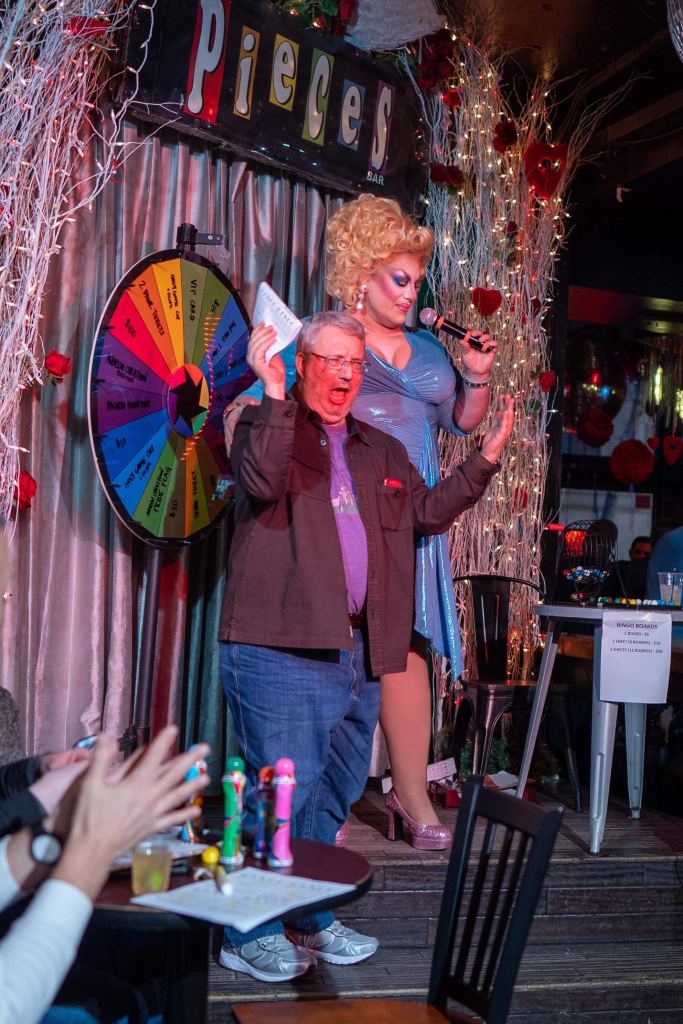 So I showed up and V&C had already snagged a table, and I got a round of mimosas and, once shop was set up, one of us got the first round of bingo cards. ($5 for one, $10 for a sheet of 4, and $20 for 3 sheets of four. We were playing two cards a game, for six games, so if you do the math, we each ended up buying one round of 3 sheets each.) The setup was generally: queen does a number, then runs a bingo game. First round was standard bingo, but others were “block out an O” or “block out an L” or (for the last one) “block out the entire card”. Winner spun a wheel for prizes, and the cash prizes went up and up over the evening – you could potentially win $1,000 in one game. Also, Miss Chaka was handing out autographed pictures to the winners.
