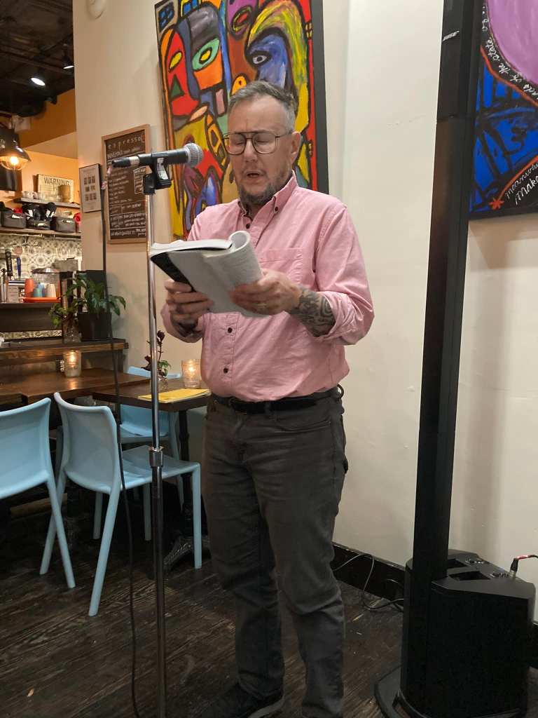 My friend and upstairs neighbor, Richard, runs a monthly author series at our local coffeeshop called First Tuesdays. When he found out my brother was an author, he scheduled Sam into the series – months and months ahead of time. So Sam’s reading was this month and Sam came up from Durham for an extended weekend. (and then Richard got COVID and it was unsure for a bit whether the reading would be cancelled – which would have sucked – but he got a substitute and it did happen)