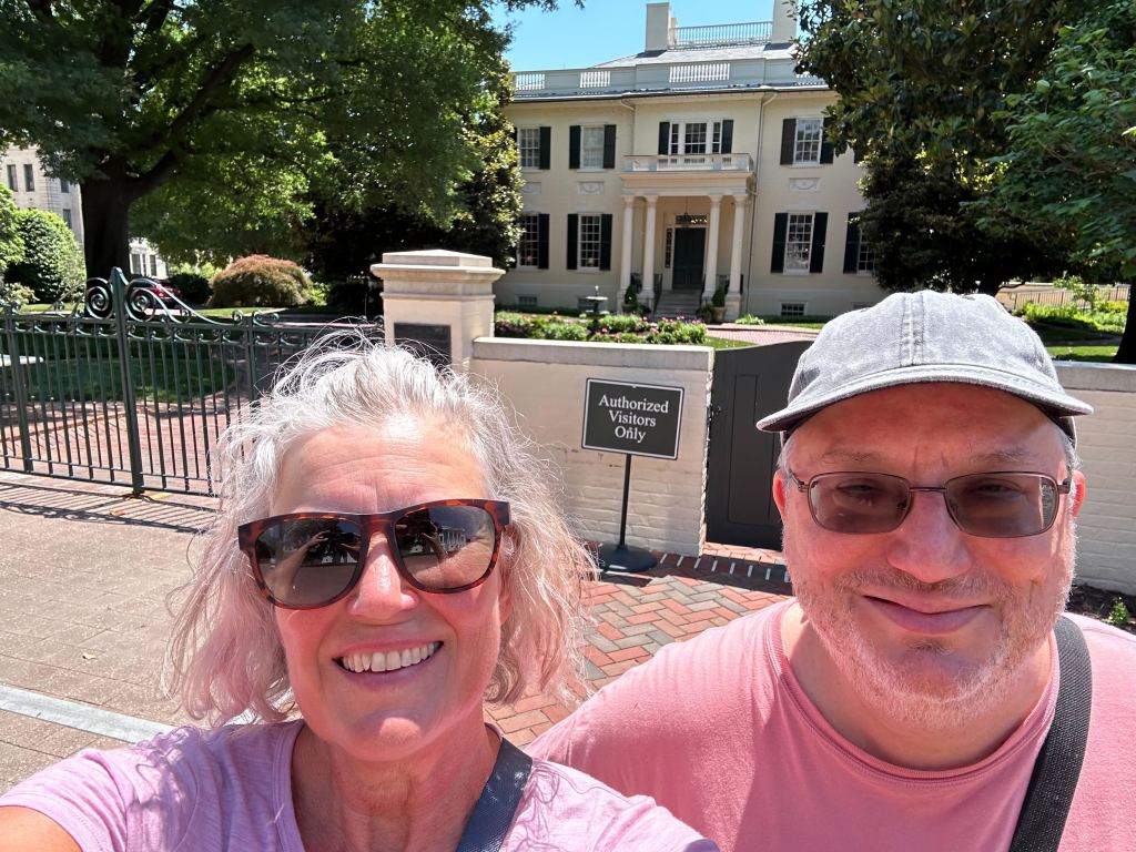 Wednesday, Liz had the day off, so we started the morning with a walk around the pond on the University of Richmond campus. I didn’t even know there was a U of R, but apparently it’s quite prestigious, and the college campus is lovely. I then ‘worked’ until lunchtime, and Liz took me out (in her Miata convertible! with the top down! and yes, I made Isadora Duncan jokes, although I may have mixed her up with Jayne Mansfield) for sightseeing. We went first to drop in on the Jefferson Hotel, just to look inside, it’s very schmancy. Then to the Virginia Capitol to walk around the grounds and also to look at the Governor’s Mansion. All very pretty, and it was a beautiful day. We also walked by the Dominion Energy Center, which is where the Richmond Symphony performs. I’m willing to bet this is where Brad and I saw the New York City Opera’s tour of La Boheme back during our college days. Lunch at Wong Gonzalez, a trippy mix of Latin and Asian food – I had some kind of fish tacos, and we split some sort of yummy appetizer. More touristing as we drove back, I don’t remember what we saw.