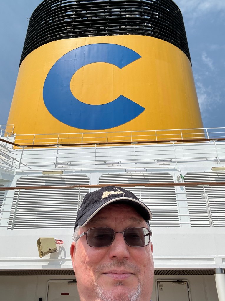 So, blow-by-blow. I’d preregistered for the first boarding group, and left my house about 11:00 via Uber for an 11:30 time slot. For a short cruise, they only allow you to check one suitcase, but of course you can schlep around however much you want outside of that. I’d figured I’d need a second luggagey thing, and had some good options, but once I packed, I realized I really only needed an overhead-sized small roller, so it was that plus my backpack. Checked the big suitcase, went through the boarding process with a thousand other people, and it moved very quickly. But I was expecting at some step to get my room key, and it turned out that you only got that when the rooms were ready at 1:30. (They literally keep the doors shut to the room corridors, then open them with a flourish at 1:30.) They also expected you to go to your ‘muster station’ to get your safety briefing as soon as you got on board, and while I was happy to do that, the first I heard about it was when I got on board and just was not sure what was next.