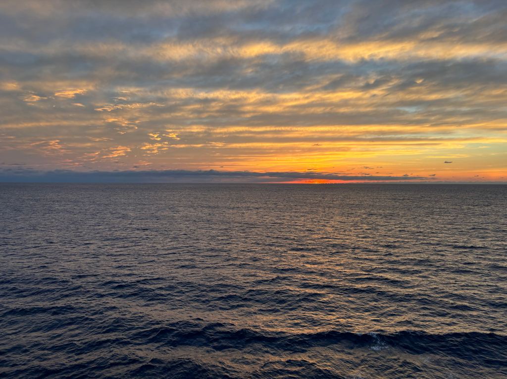 I feel like yesterday afternoon was kind of rushed, but there wasn’t really anything going on. I had a sandwich at 3:00, then right before 4:00, waited in a long long line to get a very expensive pina colada to drink while we set sail. Parked on the Manhattan side as we headed out of the Hudson, then switched to the other side to see the Statue of Liberty. Then back to my room to sit on my own balcony and wait for my suitcase. Unpacked. Discovered that, for some reason, although I’d had every intention of bringing a variety of bags for every occasion (general tote bag, swimming bag, fanny pack, evening murse), some of those never showed up. How did I not pack them? Anyway, I ended up buying a Carnival-branded shoulder-baggy thing for way too much money, but it’s doing the trick for stuffing my phone and kindle and handwipes in.