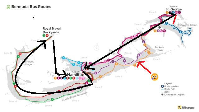 This was my route. The sad-face part is the #3 bus route I wanted to take back from St. George’s, but didn’t.