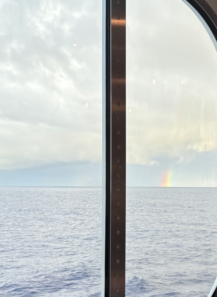 This time I got seated pretty much against the window – well, the table next to the table by the window. That table was populated by three middle-aged men and I was like, “queers, I’ll bet”. So I forced my way into their conversation with my smooth skills, and yep, I was right. They were from Long Island, I think one of them was a couple. They were familiar with Jackson Heights – they’d just been there for Pride, and we discussed the various JH bars. They were perfectly nice, but not enough there to like,, hang out with them for the rest of the cruise. We did see a rainbow out the window, though, blessing us.