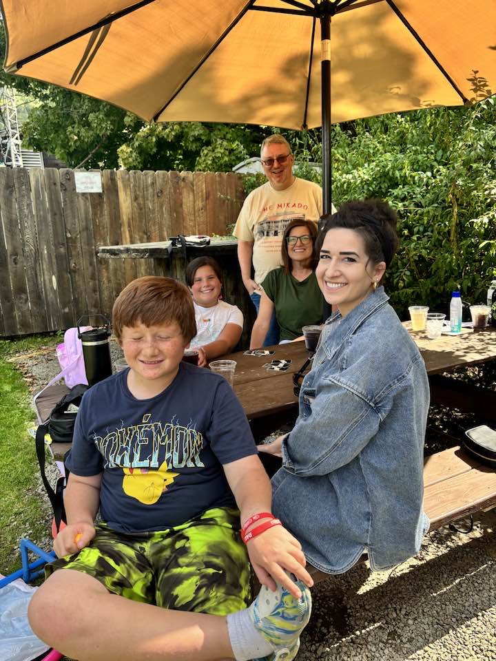 Niece Samantha had told me to meet them at the Roscoe Beer Company at 11-ish. I didn’t have any problems finding it, and the whole younger generation was waiting for me when I walked out – Sam, husband Branden, kids Olivia and Jackson, and younger niece Allison. I made them line up for hugs. The plan was to get a starter drink for everyone (root beer for the kids) and grab a picnic table out in the beer garden. This was an excellent plan and we spent hours there, drinking (I only had the one beer, then switched to root beer), eating many appetizers, talking and playing lawn games.
