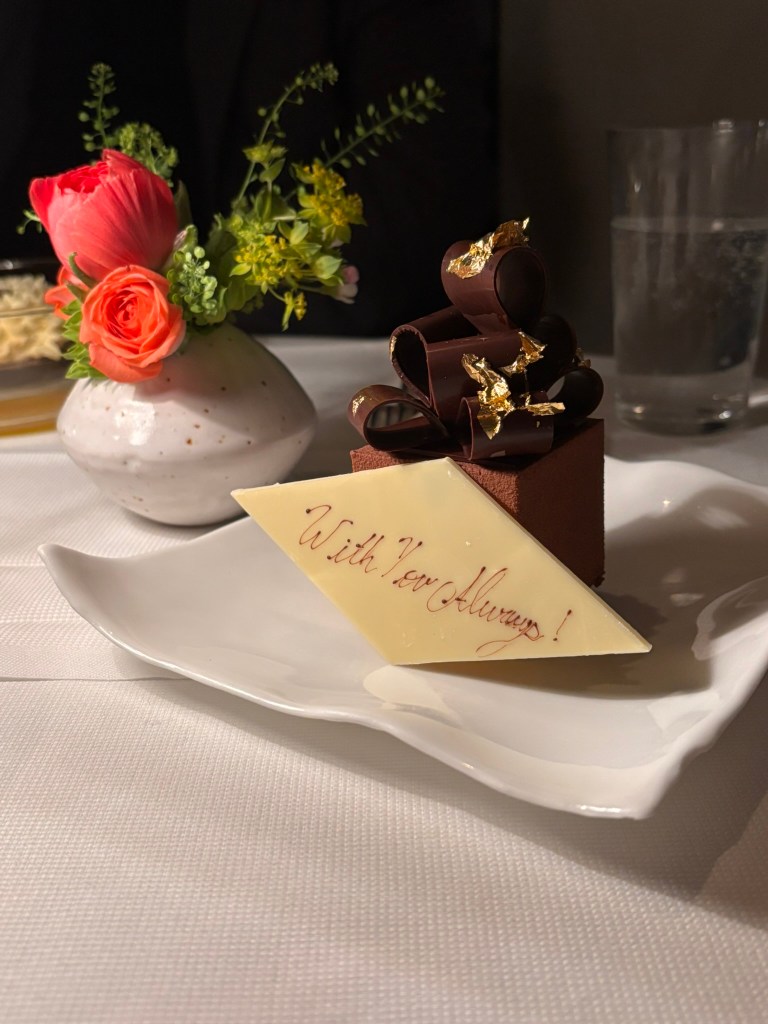 6. Passion Fruit Flower with hazelnut dacquoise and passion fruit jus. You can see this in the later pictures. It was super-pretty and he advised me to cut it up ‘like a pizza’ so you got all the ingredients in one bite. I was also gifted (I think) the chocolate dessert, along with the little candy sign that said With You Always, very kind and (literally) sweet.