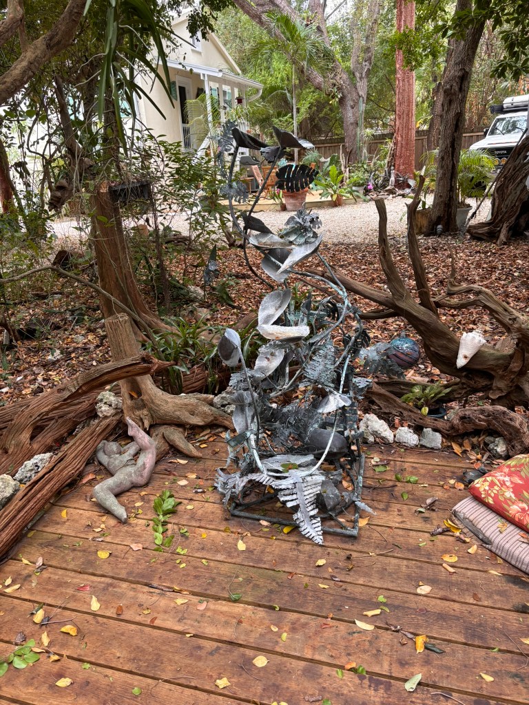 Stop 1 was the Old Road Gallery, named thus because it was not on Route 1, but on the old road parallel – I had to make a left onto a side street, then up back north. This was a fun gallery and I chatted with the proprietors a bit. There was some pottery I really liked, but I’ve learned the lesson in the past that pottery doesn’t travel well in a suitcase. I suppose I could have had them ship it… ah well, no biggie. They have a sculpture garden – a series of paths and sculptures and little gathering areas with tables and stuff, very sweet, although in this weather, not a great place to hang out.