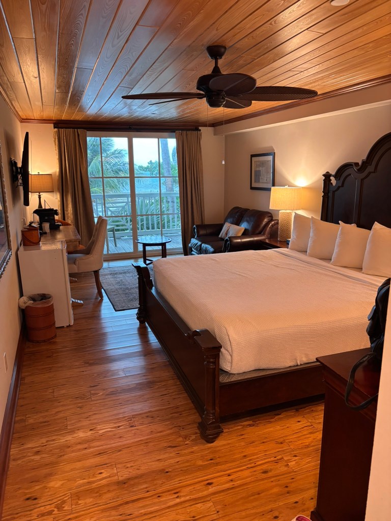 Off to the Grassy Flats resort – which was hard to see from the road and I had to go through the whole U Turn Experience again, which was doubly tricky since it was pouring rain. My room wasn’t ready yet, but they were working on it. There’s a resort cat named Wilma! who was snoozing in the lobby. The counter lady was super nice – she suggested I go to the tiki bar and get my free welcome drink, which I did – vodka and guava juice – had a nice chat with the bartender. But the weather made sitting in an outdoor bar not that much fun.