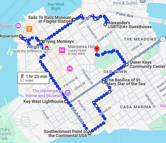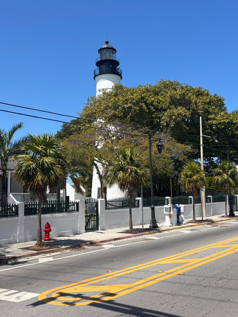 My full day in Key West was exhausting, dahlings (I did over 20,000 steps), but great fun. I got up, did the morning stuff, had breakfast, and headed out. I was in fact slathered in sunscreen, and wished I’d had a real wide-brimmed sunhat rather than just a baseball cap – it was very bright and sunny. I decided to head north and after doing a weird detour around a little residential neighborhood, ended up at my first stop, the Sails to Rails museum. The poor ancient docent had to wear an old-timey costume, but luckily, it was cool inside. It was mostly about the railway that Henry Flagler, with his partner John D. Rockefeller, built down the Keys, the first time the keys were connected by land. The railway was hot stuff for about 25 years or so, until a huge hurricane destroyed a big part of it.