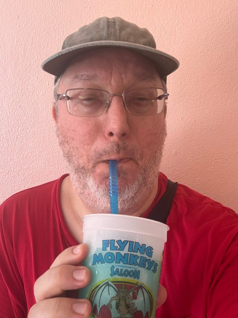 There was lots of shopping stuff around there, and I realized I was on the north end of Duval Street (which for some reason in my head was east west, but it wasn’t). So decided to head south. First order of business was to get some sort of frozen drink – I was hot (yes, I’d been drinking water). Found a bar which had all sorts of frozen drinks and was set up to directly sell to people on the sidewalk. They actually only had a couple of options for a virgin slurpee-sort-of-thing, and she actually gave me a sample of what I ended up getting, a blue raspberry/lemon concoction. Just what I needed.