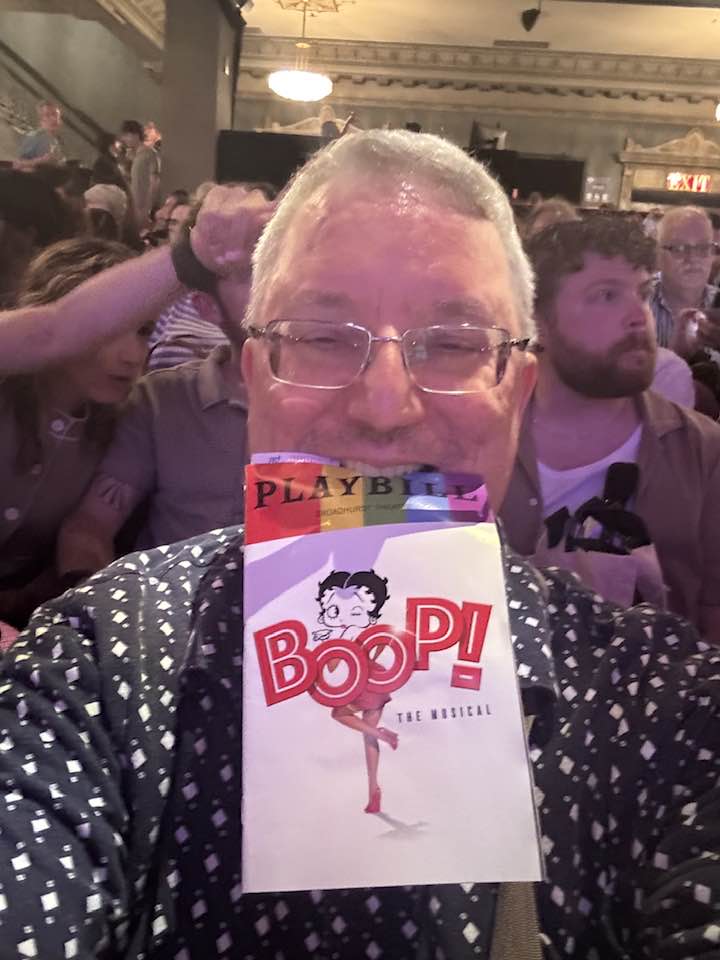 My former neighbors, who’d come back to watch the Tonys with me a few weeks ago, and I were plotting to go see Operation Mincemeat on Tuesday, but even though it was on the TKTS board at 3:00, by the time I got there at 4:30, it was gone – and off to the box office, it was sold out! So they stayed home, I went back to TKTS and got a ticket for Boop!, which is also closing soon. The ticket turned out to be terrific, row G, right in the middle.