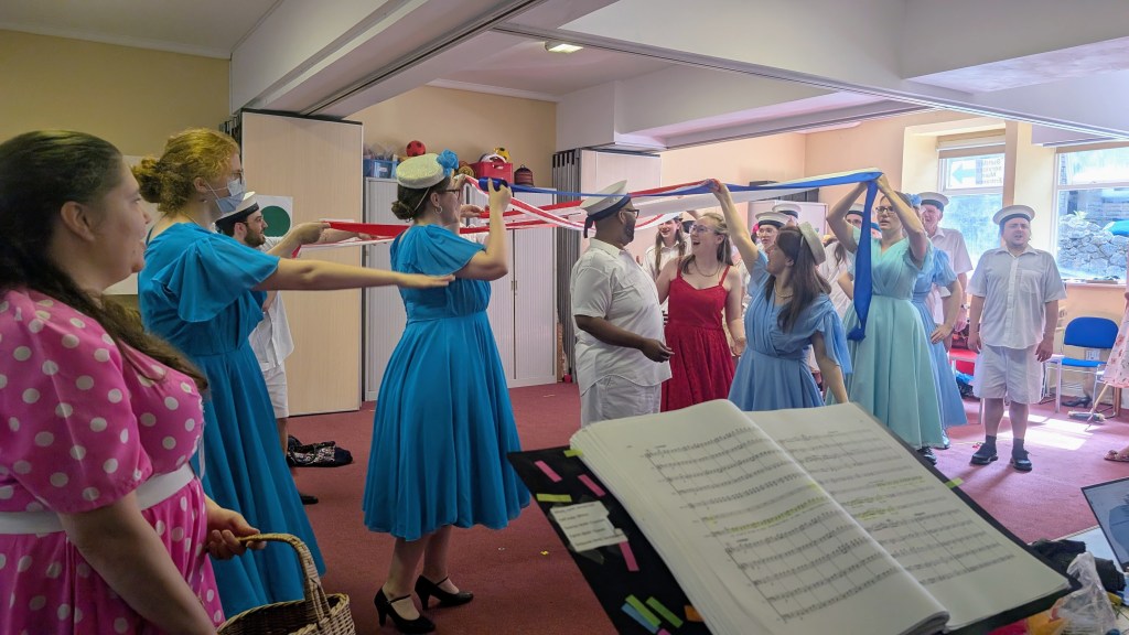 Wednesday, our last day in the rehearsal hall, was a really good rehearsal. We had a very specific list of musical stuff we were tackling in the upstairs room (the sanctuary, I guess), cleaning up harmonies in the four-part men’s chorus in ‘A maiden fair to see”, working on the trio in “A British Tar”, the quartet in “Farewell, my own” and so on. Just some detail work that really helped.