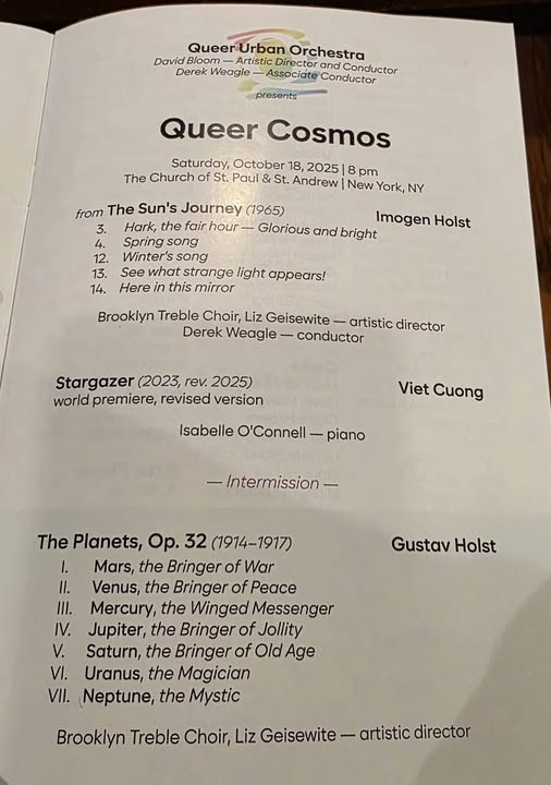 Yeah, we had our first big Queer Urban Orchestra concert of the year. The season’s theme is “A Place for Us” and the concert was titled Queer Cosmos. The big featured piece was Holst’s The Planets, which I’d never played in its entirety. (I’d conducted and played “Jupiter” – different performances – which is like God’s gift to the horn section, and I’d actually played “Mars” in the band arrangement on tuba, go figure.)