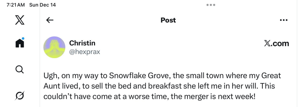 What else? Still watching lots of Hallmarky movies. This X post made me laugh today: