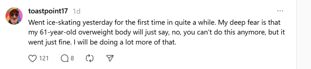 Oh, I actually got my large aged ass over to the ice rink this weekend. I think I’m going to actually start actively planning and try to go at least twice a week, and once I remember how to do the stuff I’ve already learned, sign up for a class or, better and more effective, work with a coach. My fear is always, as a heavy man with back problems that often manifest as leg and knee problems, that I’ll get on the ice and it just won’t happen any more – my leg will just give out, or the back or the body will just go ‘nope nope nope’. But I did just fine on Sunday – I did a tentative three-lap run, then got off to tighten my laces, then a 4-lap run, then a 5-lap run. This takes longer than you think, when the rink is crowded with a thousand people, half of them kids, and many who just don’t know how to skate, so can wipe out in front of you at any minute. I’m definitely going to start going to the coffee club/adults-only sessions next week (both of my local rinks have them). They’re mid-morning during weekdays, but I can adjust my work schedule if there are no meetings during the time slot. I’m excited! Just to be moving again, and perhaps start the weight loss again. (I’m down about 25 pounds from last year, but am at a plateau.) And skating, once you’re reasonable comfortable with the basics, is just such a joy.