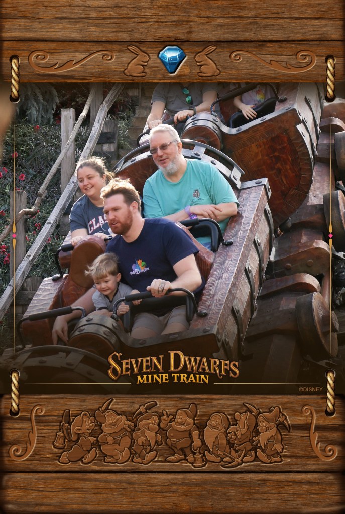 Powerwalked through and around all the families to the central hub and then up the 2:00 spoke to Fantasy Land, but I found myself in a crowd and it turned out they were waiting for the ‘rope drop’. So like, if you weren’t an early bird, they still let you in, but wouldn’t let you go anywhere fun until 9:00. So I had to backtrack to a different path they showed me and check in again as a special 8:30 person. That was weird. Then powerwalked to the Dwarf Mine ride, which already had a 45 minute wait, oh well. They are super-good, though, about making sure the bulk of the line is in the shade and has interesting things to look at and sometimes play with as you wait. And the ride was fun!